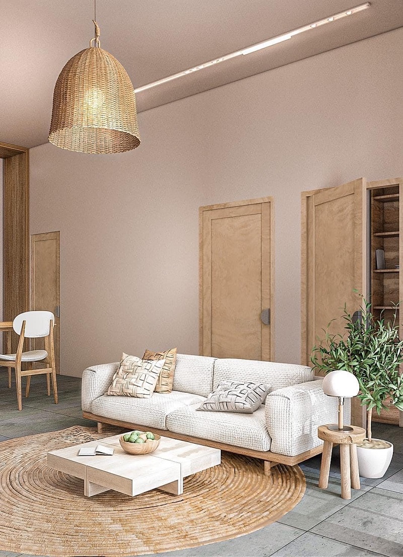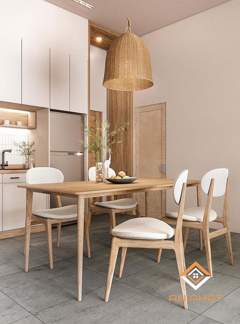 Màu hồng phấn nhạt là đặc điểm của ngôi nhà, kèm theo đó là tone màu gỗ là điểm nhấn cho không gian phòng khách liền phòng bếp. Nội thất của ngôi nhà đã được sử dụng tone nâu gỗ để cho ngôi nhà thêm ấm cúng hơn.
