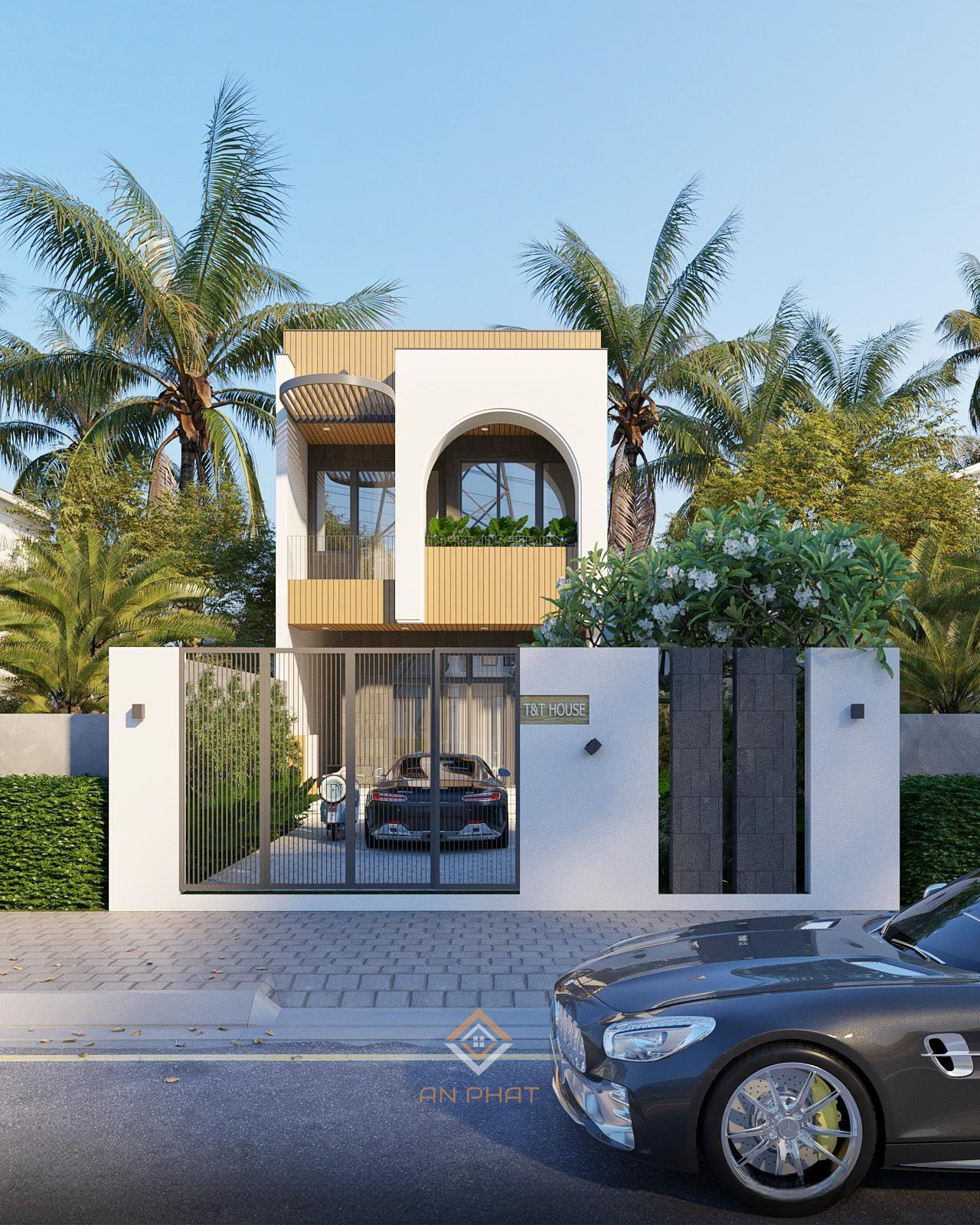 Mẫu nhà phố 2 tầng hiện đại  8x30m lấy gam màu trắng nâu làm chủ đạo. Tường sơn trắng làm nền tô điểm cho phần ốp đá và hệ lam gỗ thêm nổi bật hơn. Ngôi nhà được thiết kế nhiều khoản trồng cây xanh làm cho ngôi nhà có không khí trong lành thoáng mát hơn.