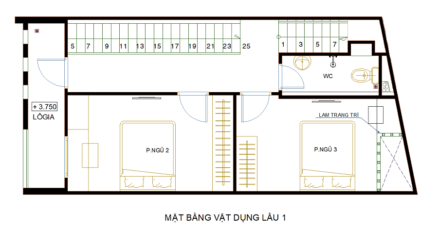 Mặt bằng lầu 2 mẫu nhà phố 5x10m 3 tầng tại Đức Trọng.