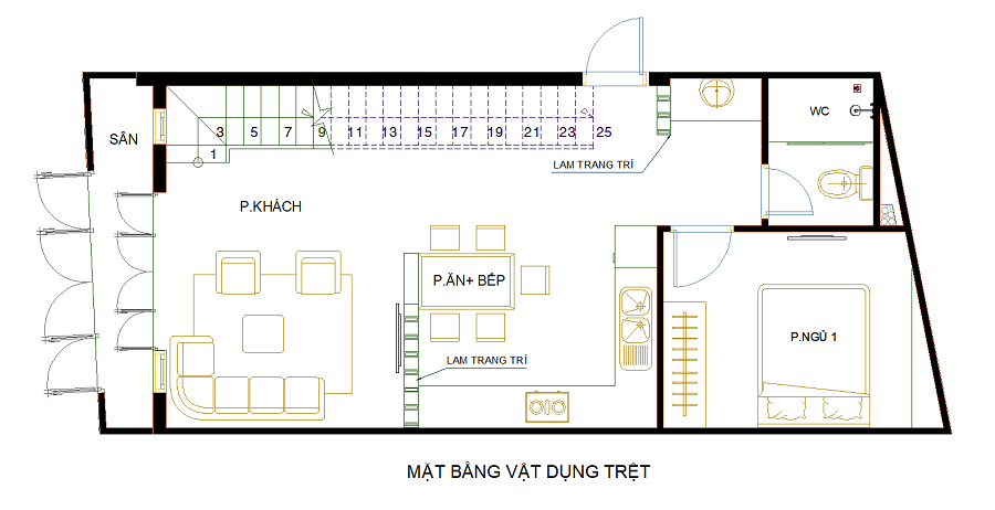 Mặt bằng tầng trệt mẫu thiết kế nhà phố 5x10m với diện tích nhỏ bước vào trong nhà là không gian phòng khách, bố trí sát cạnh cửa chính, đảm bảo cho sự lưu thông khí cho khu vực này. Thiết kế liên thông với phòng khách là khu vực bếp + ăn, không gian này kiến trúc sư chú trọng đến việc thoáng khí, tránh mùi thức ăn đọng lại nên chủ đầu tư khá hài lòng, tiếp đến là cầu thang, phòng vệ sinh chung và 1 phòng ngủ.