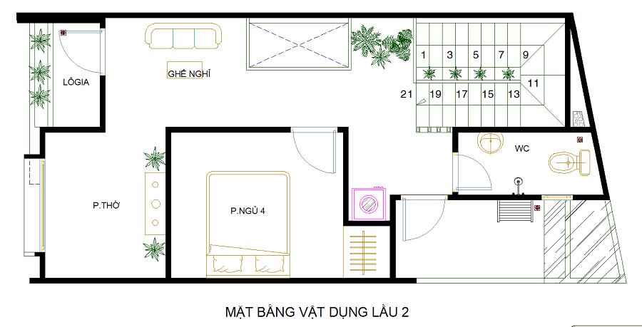 Công năng lầu 2 được thiết kế 1 phòng ngủ dự phòng, sát bên phòng ngủ là phòng vệ sinh chung và cầu thang thông tầng. Phòng thờ bố trí hướng ra ban công mặt tiền và có 1 loogia nhỏ. Kế bên nhà vệ sinh là khu vực để máy giặt và sân phơi.