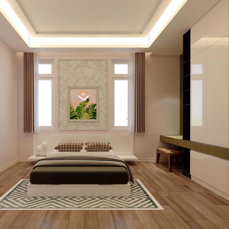 Phòng ngủ được thiết kế lát gạch giả gỗ kết hợp với đồ nội thất tủ giường bằng gỗ công nghiệp đa dạng về mẫu mã.