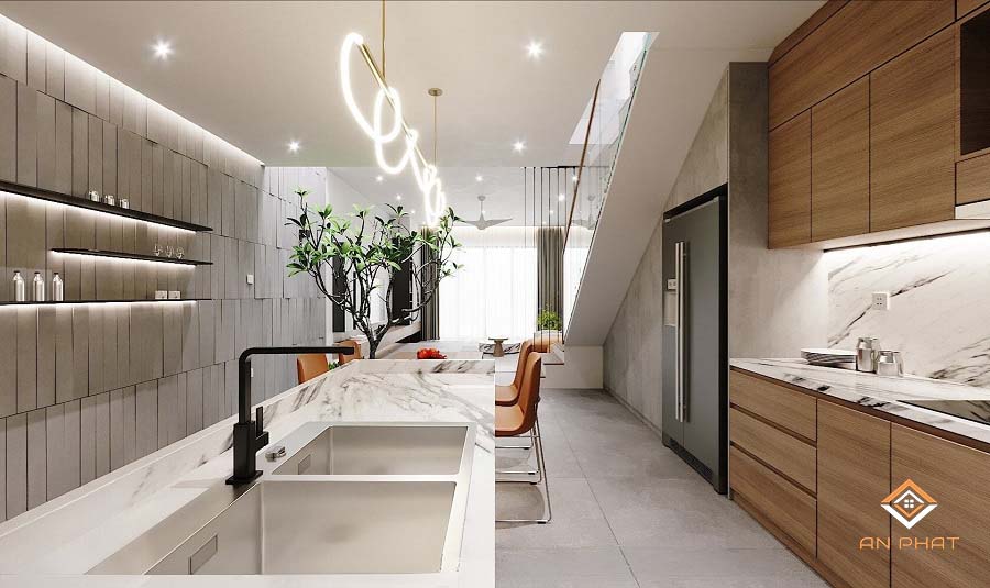 Với thiết kế không gian bếp rộng rãi với ô thông tầng nhận ánh sáng tự nhiên và cây phát tài núi lọc không khí mang lại ý nghĩa phong thủy trong gia đình.