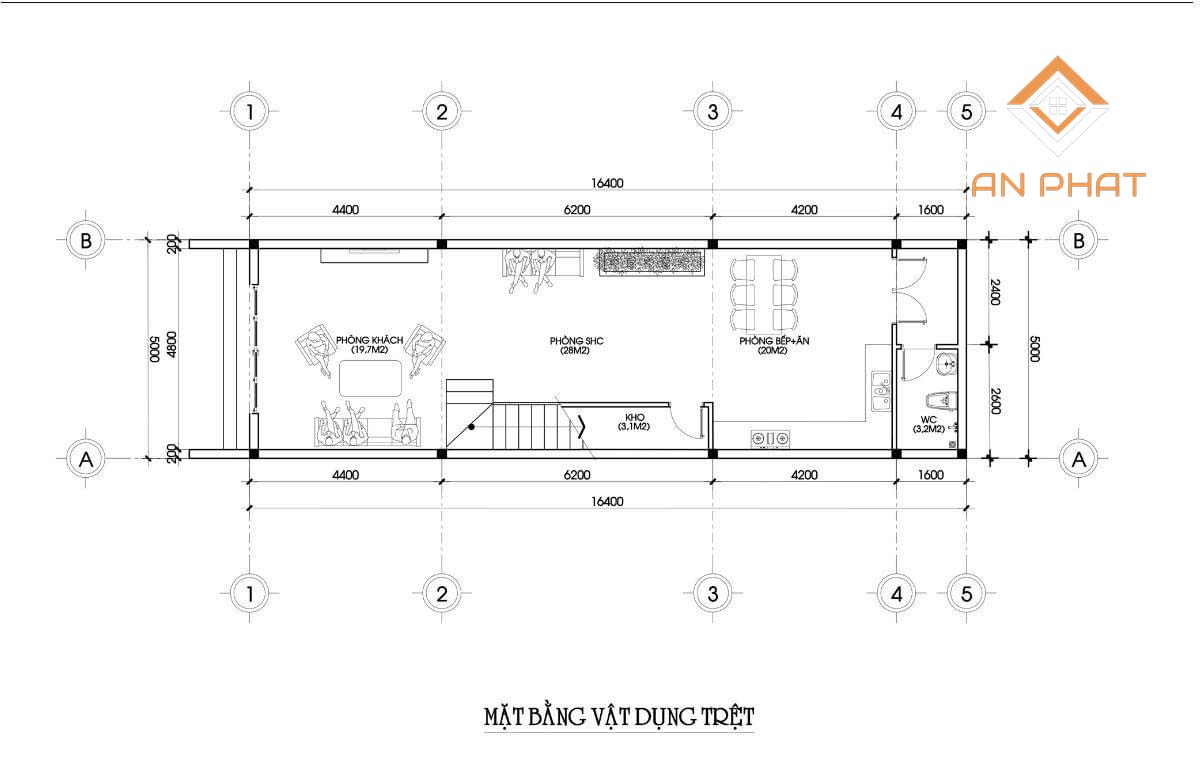Mặt bằng bố trí nội thất tầng trệt công trình anh Đạt.