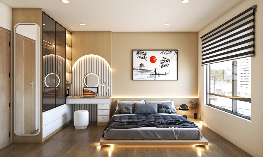 Phòng ngủ bố mẹ được thiết kế rộng rãi hơn có tủ đồ và không giản thoải mái hơn, tủ đồ kết hợp với bàn trang điểm vừa đủ dùng.