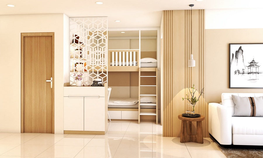 Để bố trí vừa đủ không gian học và chỗ ngủ của con thì phương án được đưa ra là giường tầng để vừa với diện tích của căn hộ chị Ly.